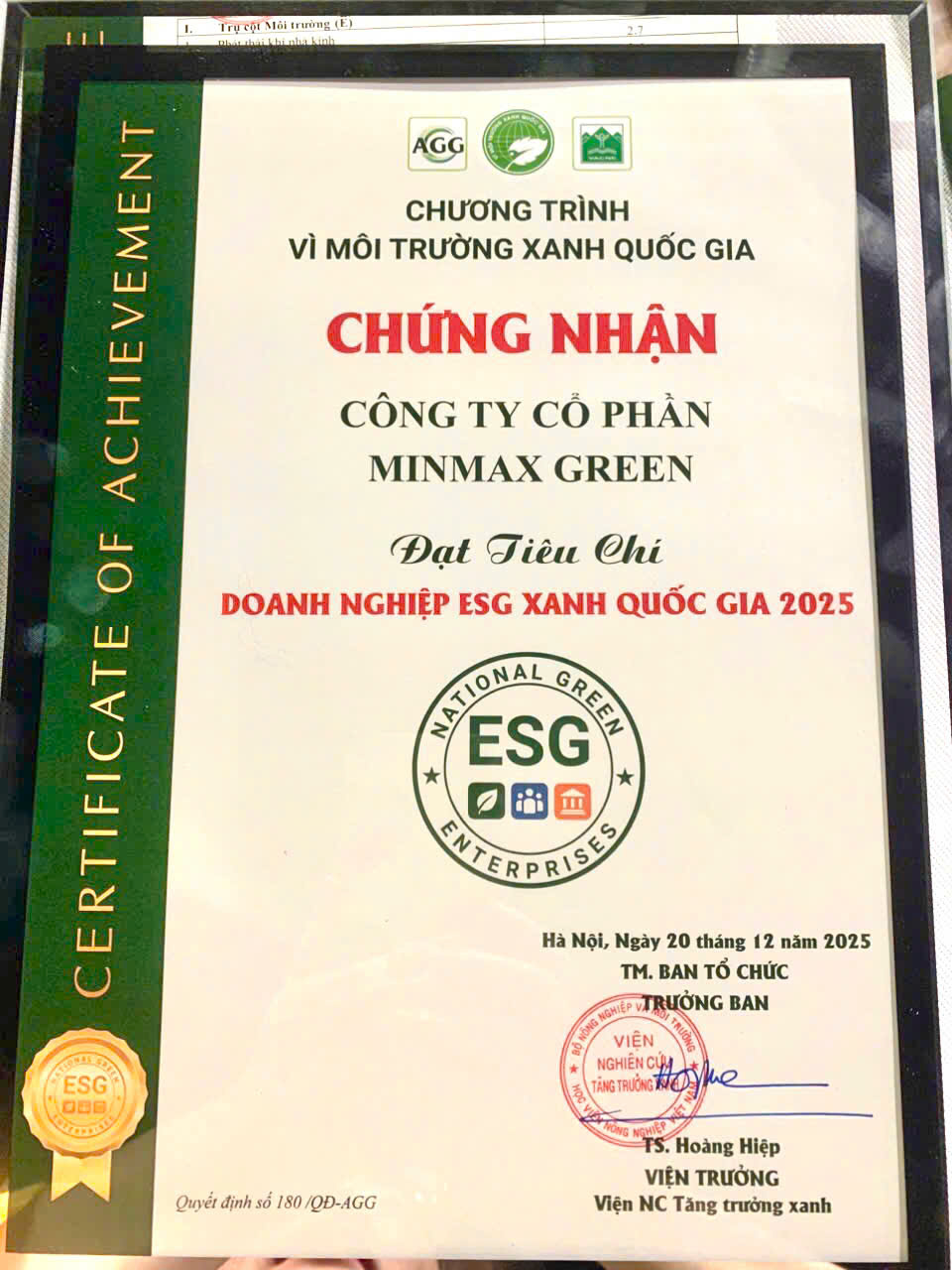 Within the framework of the “National Green Environment” Program, MinMax Green is honored to be awarded and recognized among the Top 20 National Green ESG Enterprises 2025 at the Program’s Closing Ceremony and the Announcement of the “National Green ESG Enterprise 2025,” held on December 20, 2025.